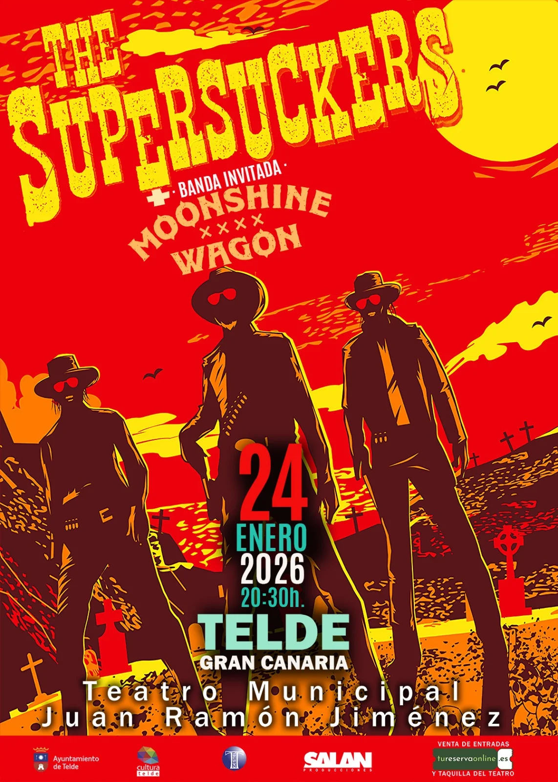 Supersuckers & Moonshine Wagon – Rock sin concesiones Los legendarios Supersuckers, liderados por Eddie Spaghetti, regresan con Liquor, Women, Drugs & Killing, su duodécimo álbum de estudio. Tras casi 40 años de carrera y giras interminables, la banda vuelve a demostrar por qué sigue siendo considerada “la mejor banda de rock and roll del mundo”, fiel a su espíritu punk-rock irreverente y contundente. Junto a ellos, Moonshine Wagon, la explosiva formación alavesa de bluegrass metal acústico, promete una descarga de energía única. Con más de 1000 conciertos en 20 países y paso por festivales como Resurrection Fest o Azkena Rock, su directo combina velocidad, humor y crítica social, haciendo de cada show una auténtica fiesta.